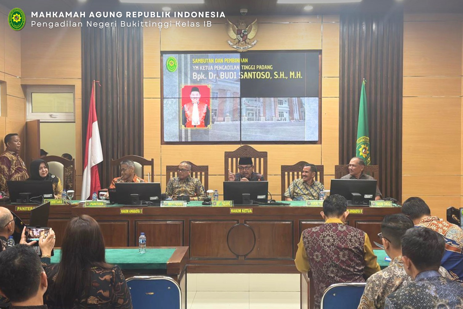 Pada hari Jumat, tanggal 10 April 2026, bertempat di Pengadilan Negeri Pariaman, Ketua, Wakil Ketua, Panitera, serta Sekretaris Pengadilan Negeri Bukittinggi mengikuti kegiatan Pembinaan sekaligus Sosialisasi Pimpinan Pengadilan Tinggi Padang yang dipimpin oleh Bapak Dr. Budi Santoso, S.H., M.H. selaku Ketua Pengadilan Tinggi Padang.